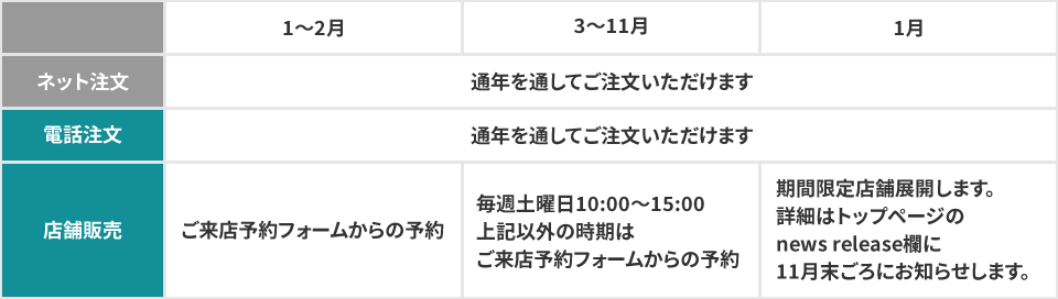 12月以外の期間につきましては1~11月は毎週土曜日の10:00~15:00を開店日としております。